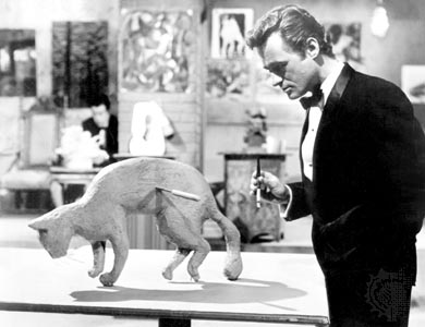 At just over 60 minutes, this short feature resembles an episode of The Twilight Zone in its construction and 50’s style. The film centers on Walter, a meek, ineffectual busboy at an artists’ cafe, frequented by painters and beat poets espousing their half-baked theories on life and art. Walter is infatuated with this bohemian world and longs to become accepted as an artist among them. One day the bumbling would-be sculptor accidently kills his landlady’s cat and, to hide the evidence, turns the cat into a macabre plaster sculpture. “I made a thing!” he proudly proclaims to his heroes, who praise it for its originality and a certain je ne sais qua. Having tasted fame, Walter follows “Dead Cat” with other sculptures made from larger and more dangerous prey.